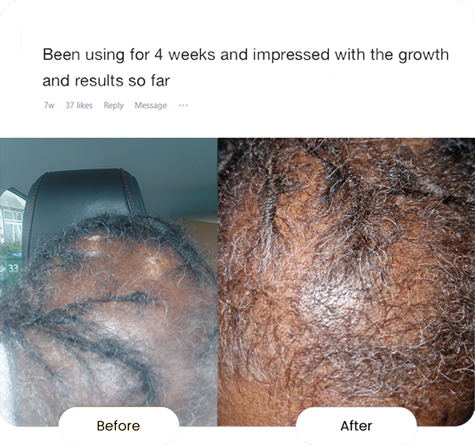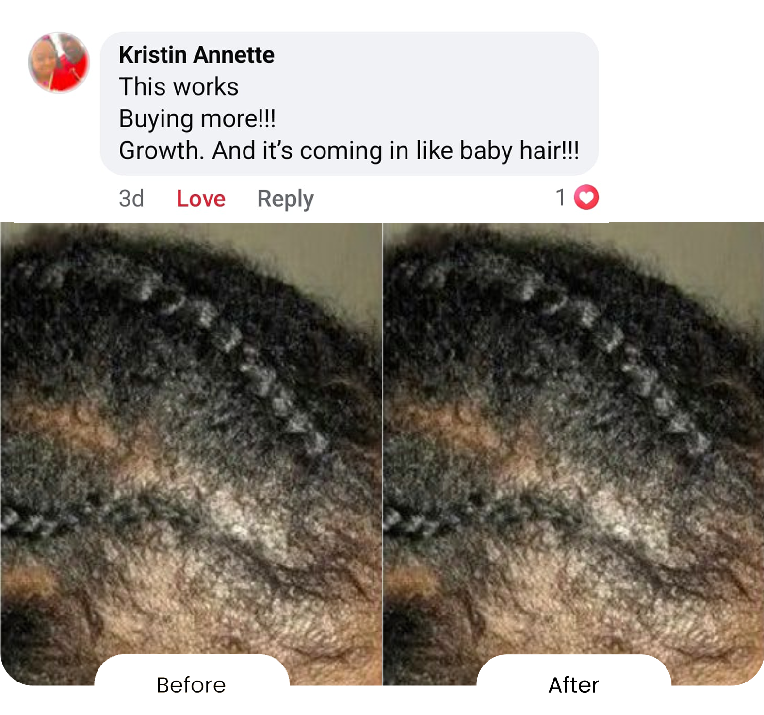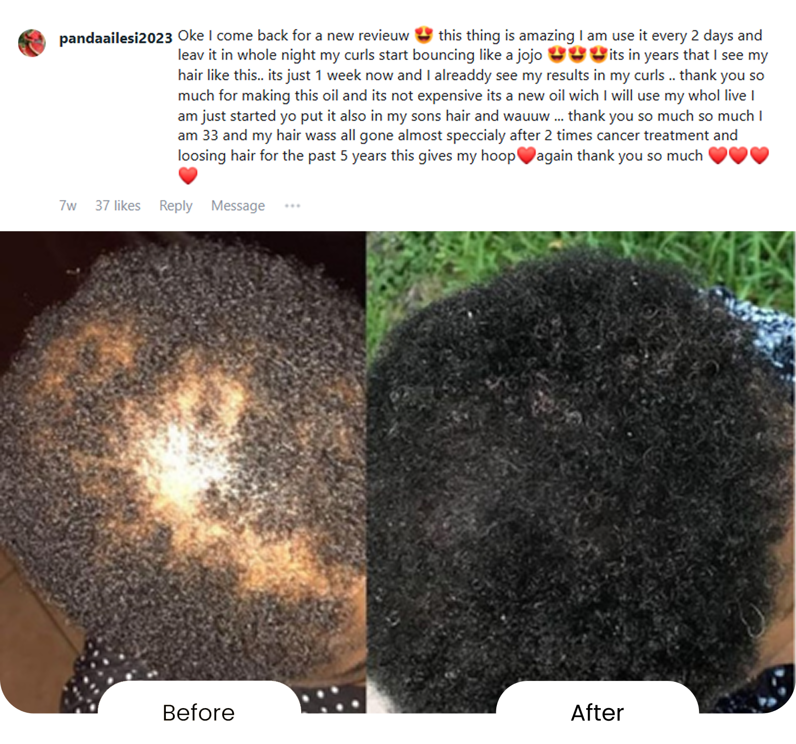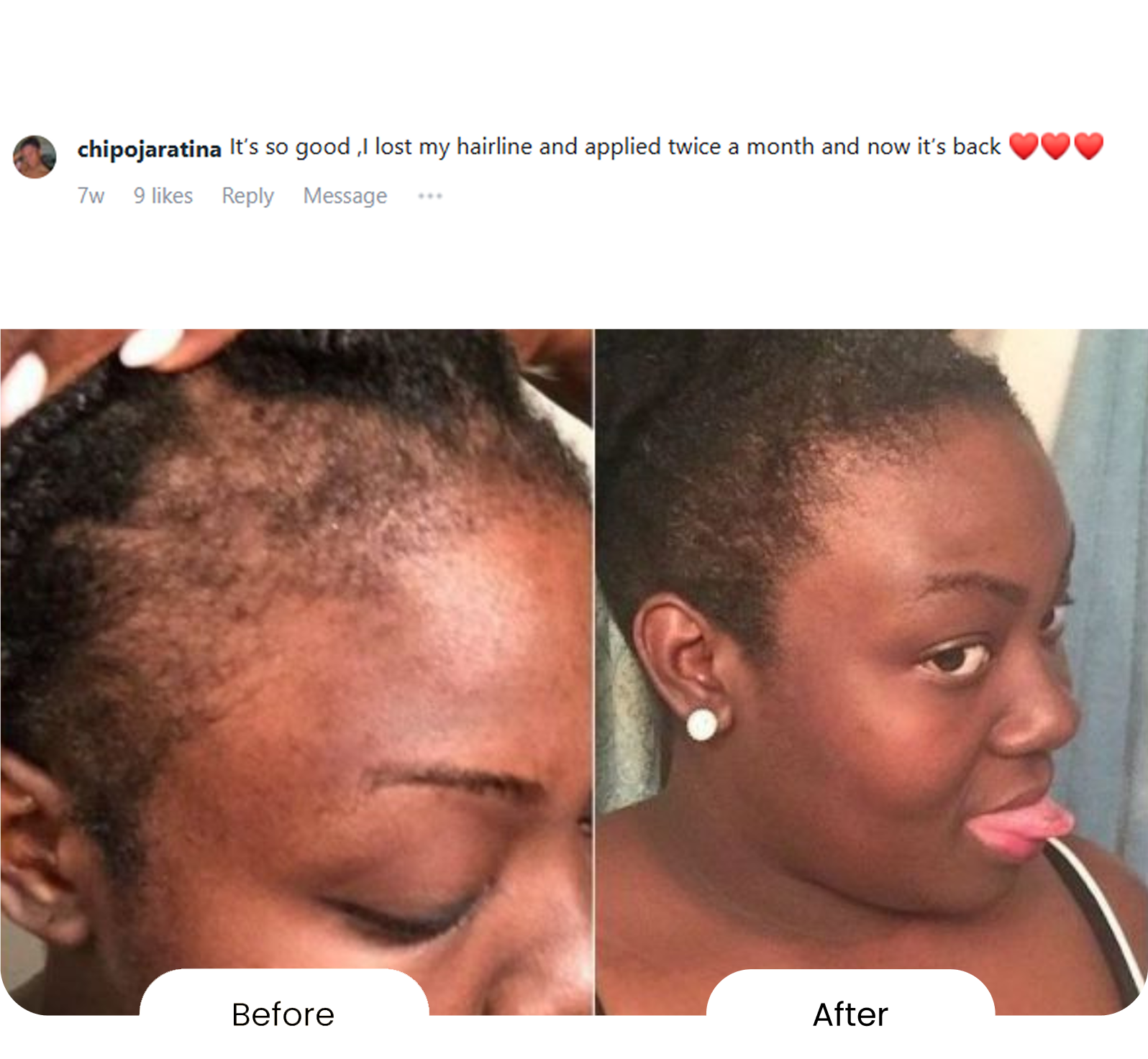 Absolutely Amazing Results! used this hair oil four weeks, and the transformation is truly incredible! My hair is fuller, healthier, and my broken edges are growing back strong and beautiful. I had severe damage and thought there was no way back, but this product proved me wrong.