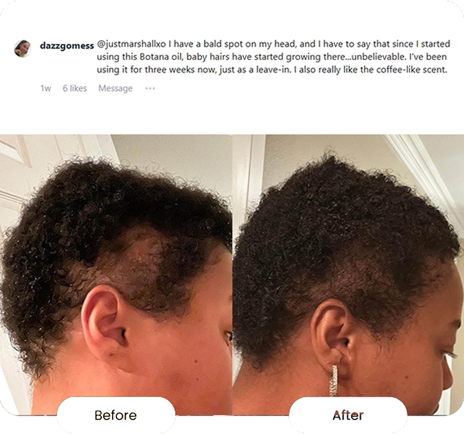 I want to apologize for hassling you about your business. It’s just that I got scammed before but I can say I was wrong, very wrong. I had been using a line of hair care that destroyed my scalp and hair, I’ve tried every medication possible, even got a vertex scalp puncture biopsy…. I ordered your Batana oil. When your oil arrived I stopped using medication and just started using your Batana oil and after a week of just using your oil the pain, inflammation, itching and breaking just calmed down. And after two weeks it’s completely gone. My dermatologist is shocked, she was gonna prescribe betamethasone and midoxil because I’ve tried 2 medi-shampoo’s and 2 steroids in 14 months. I want to say thank you, so much!!