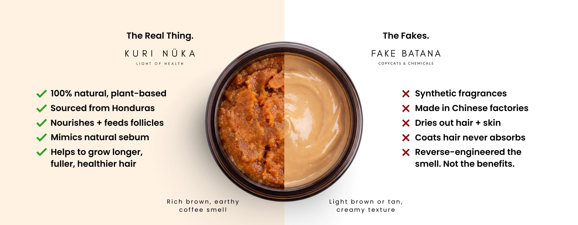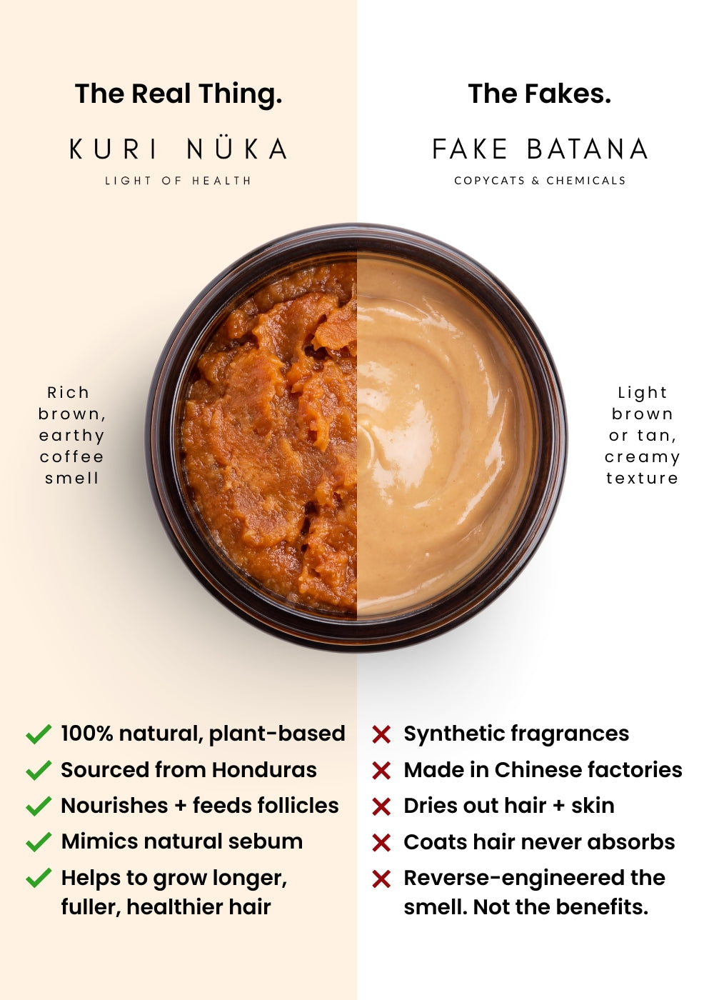 - Color: Authentic Batana oil has just one single color: rich brown — never green, grey, beige or yellow.