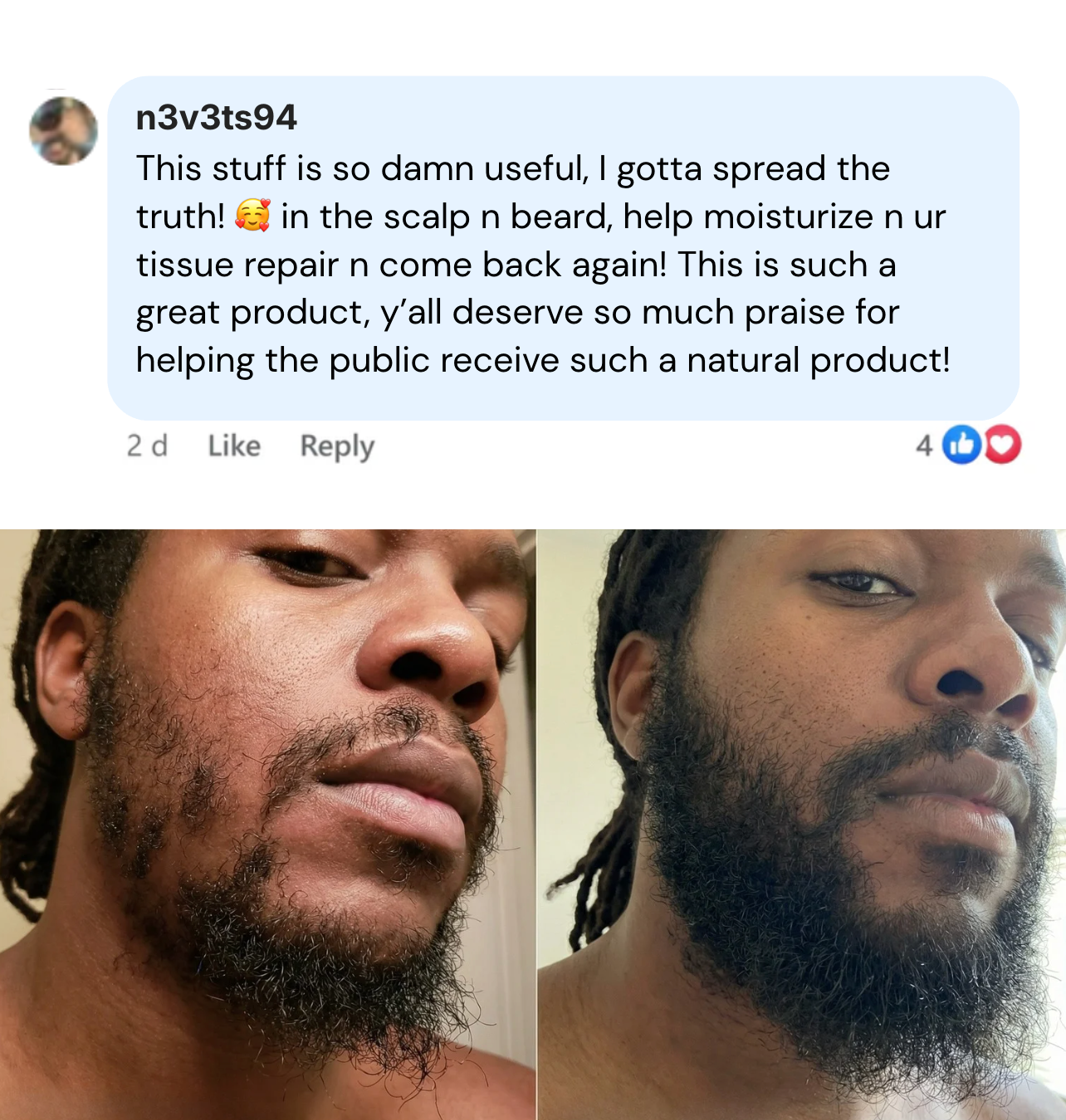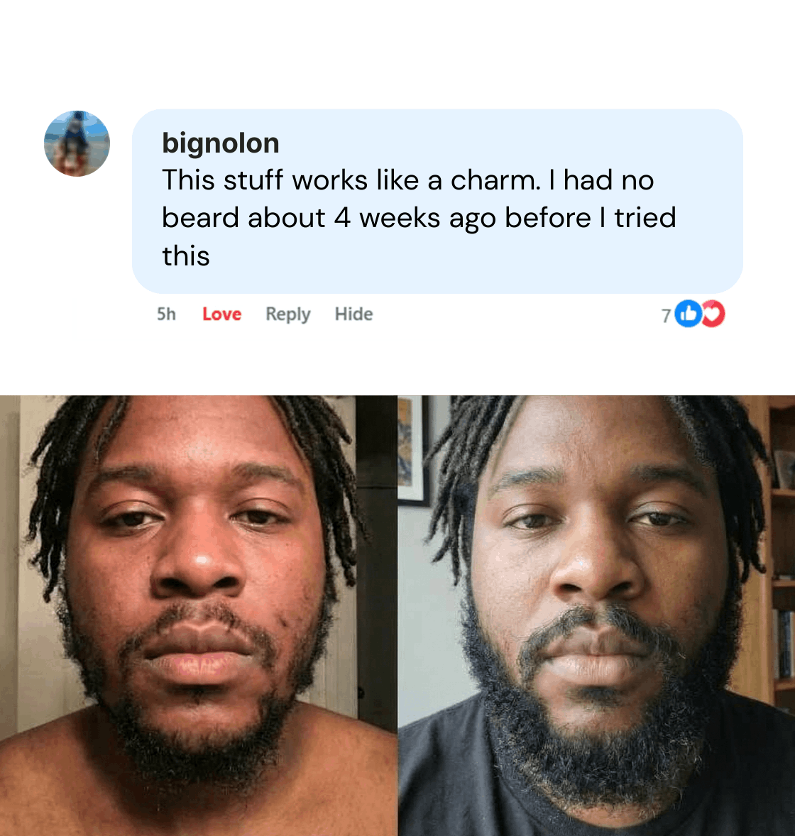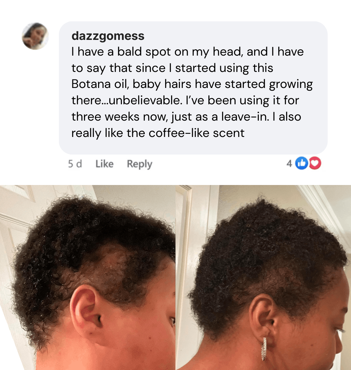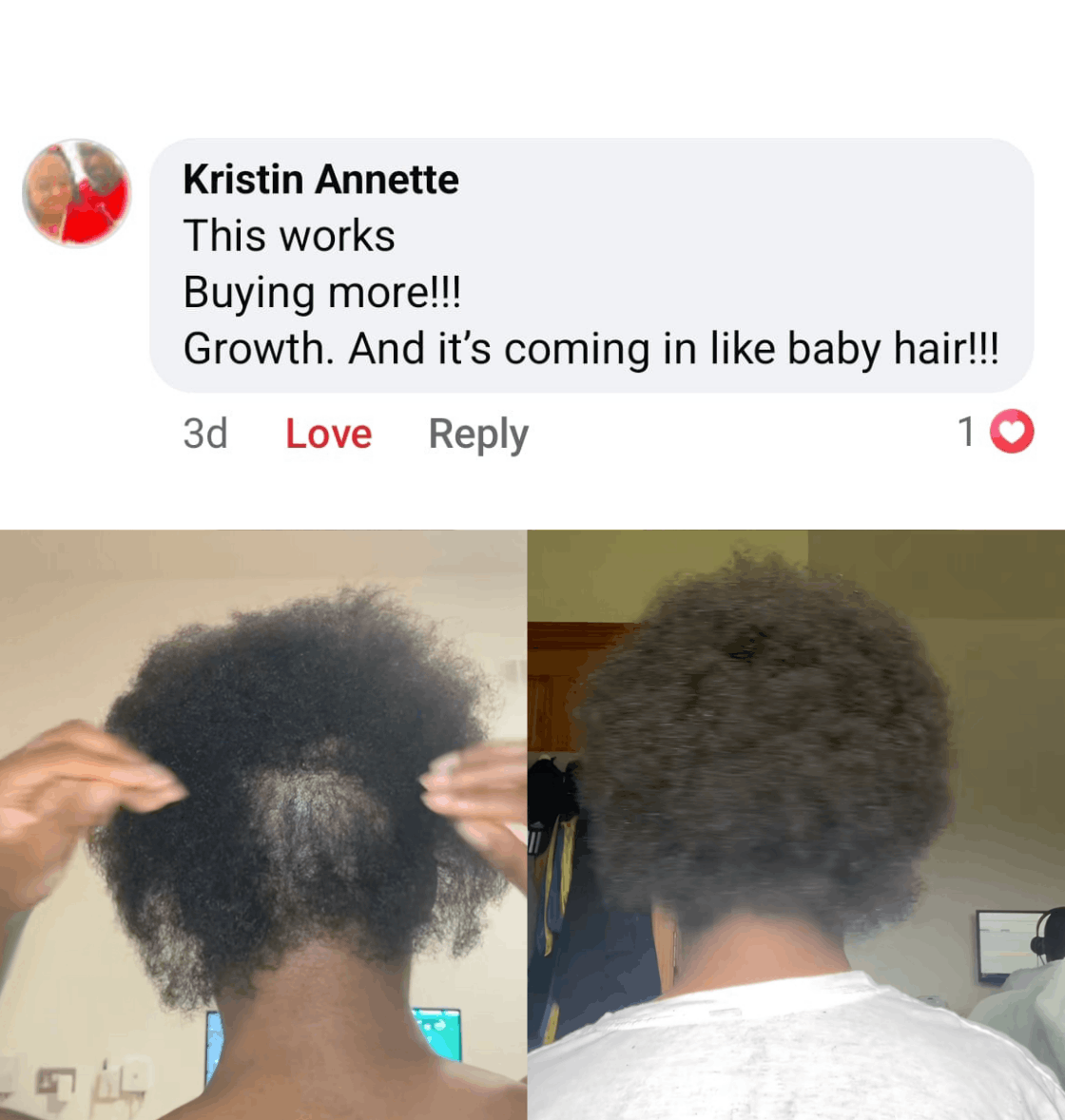 Your scalp starts to rebalance and become healthier. Hair feels softer, stronger and more moisturized. Many customers already start noticing small baby hairs appearing around the edges, hairline, the beard area, especially if those areas were thinning.